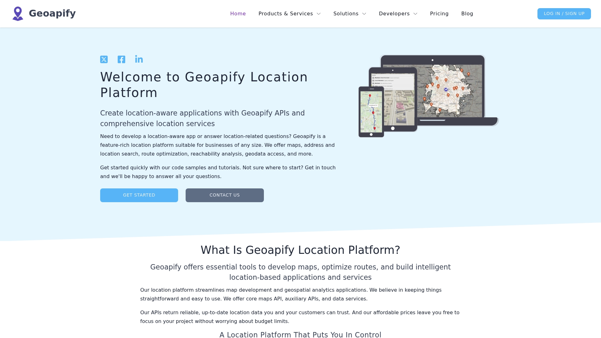 Geoapify offers Maps API with raster and vector tiles plus static maps, Geocoding and Reverse Geocoding services, and Route Planning and Routing APIs for optimization. The platform also includes Places and POI APIs, Real time Asset Tracking, and tools for Custom Map creation with code samples and a developer playground.